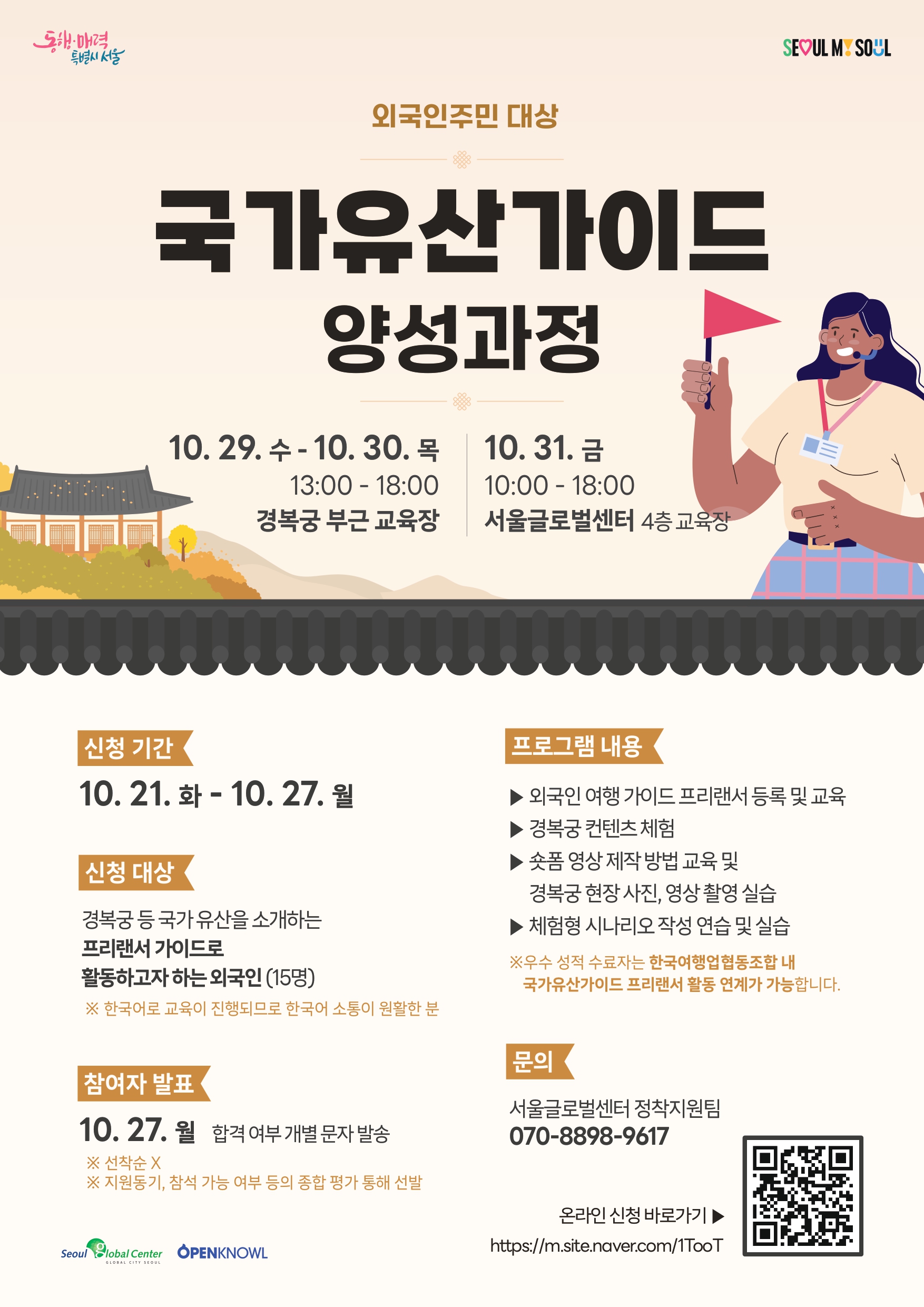 - 모집 대상: 경복궁 등 국가 유산을 소개하는 프리랜서 가이드로 활동하고자 하는 합법 체류 외국인