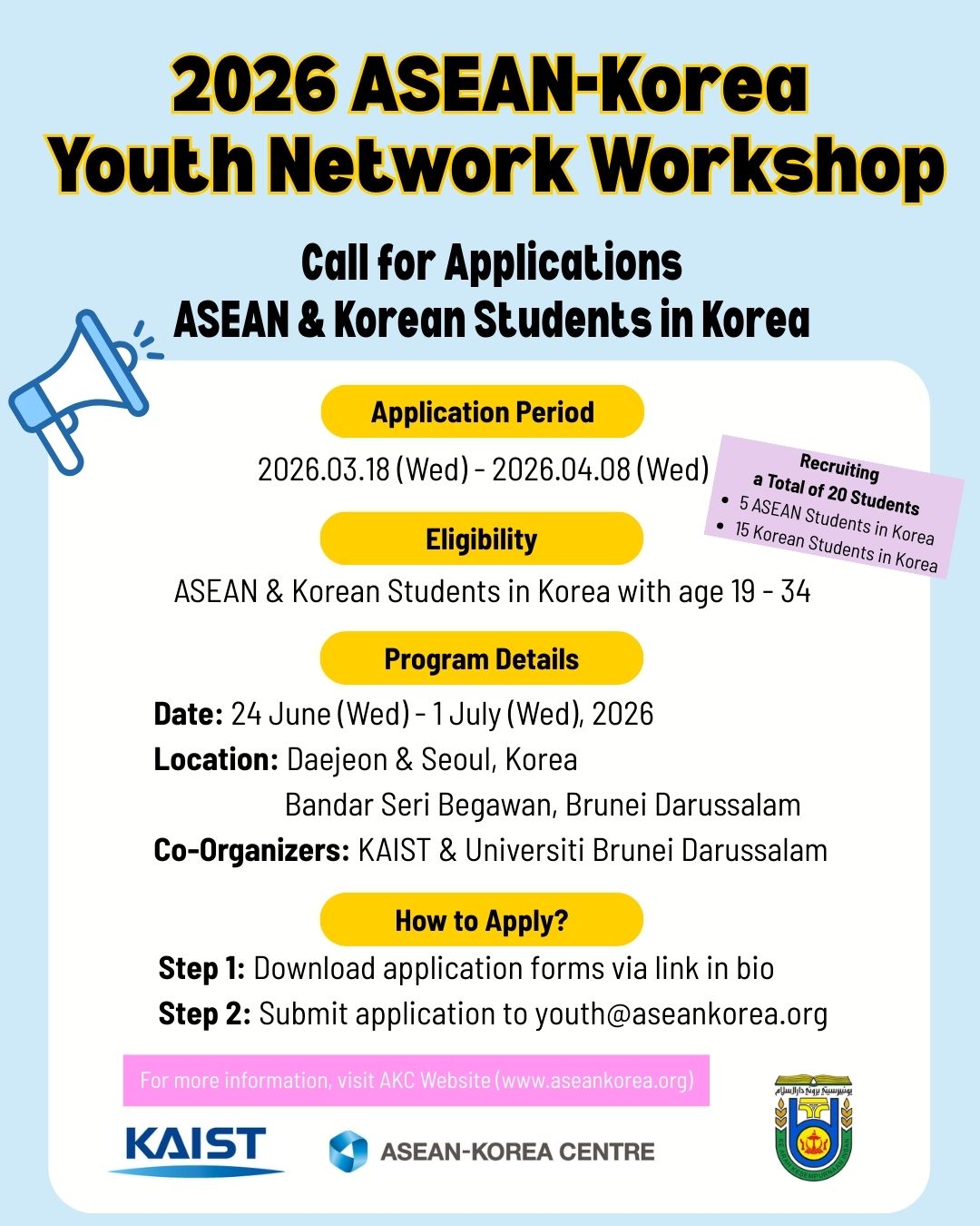 올해는 6월 24일부터 7월 1일까지 한국과 브루나이에서 진행 예정이며, 이에 아래와 같이 한-아세안 청년 네트워크 워크숍 참가자를 모집하고 있습니다.