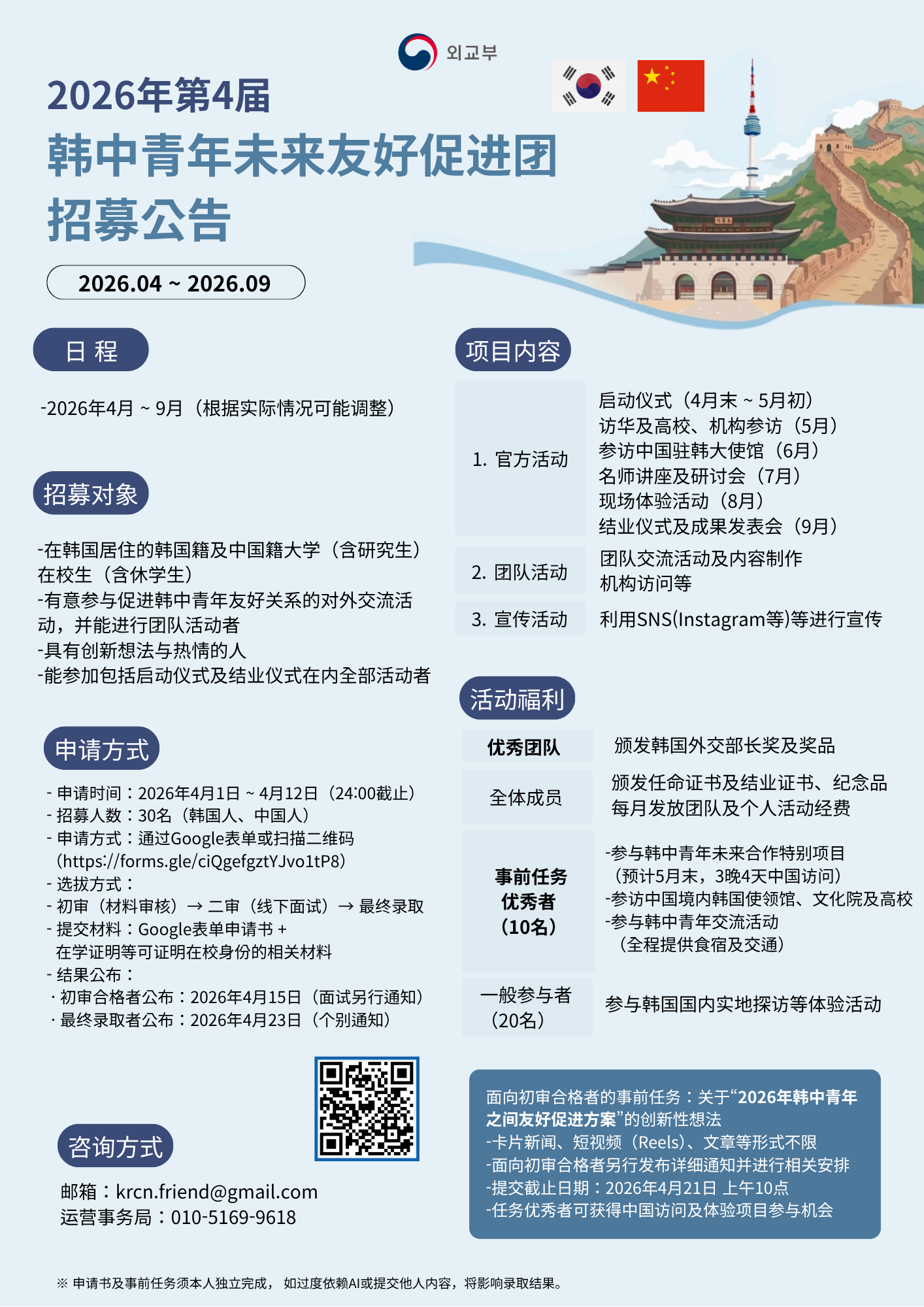 [외교부] 2026년 제4회 한중 청년 미래 우호증진단 대학(원)생 참가자 모집